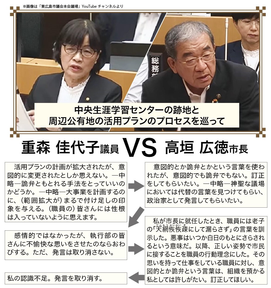 東広島市議会の第2回定例会で、6月23日に一般質問をした重森佳代子氏(清新の会)の発言が、物議をかもした。市幹部とのやり取りの後、重森氏に不適切な発言があったとして、高垣広徳市長が取り消しを求めた。最後は重森氏も不適切発言を認め陳謝したが、後味の悪さが残った。