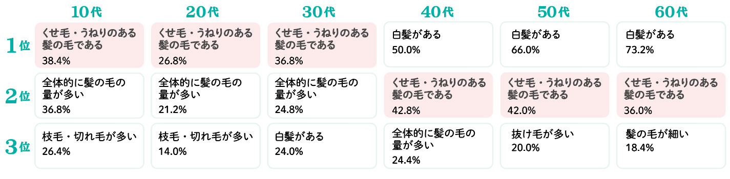 多くの人が何かしら髪の悩みを持っています。マーケティング・リサーチ会社のクロス・マーケティングが実施した調査によると、年代によって髪の悩みが変わっていく中、「くせ・うねり」は全世代共通の悩みであることが分かりました。