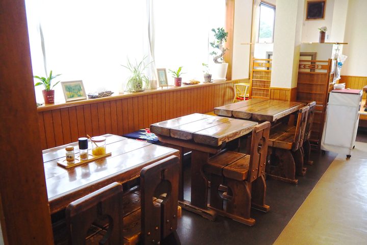 店内は木の温もり溢れる空間で、のんびりくつろげそう。窓からは外の景色も見えますよ。