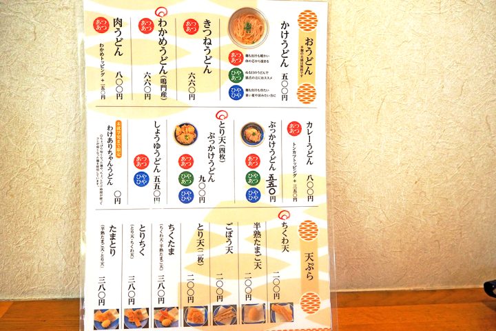 メニューは他にも、ワンコインで食べられる「かけうどん」(500円)、鳴門産のわかめをたっぷりと使用した「わかめうどん」(660円)などがあります。未就学児限定の「わけありちゃんうどん」は、短い麺や時間がたってやわらかくなった麺を使用し、無料で提供しているそう。店主が年齢によって量を調節してくれるため、子ども連れでも楽しめます。