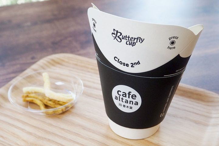 食後には、コーヒーとかりんとうの試食が。コーヒーは初めて見る容器で、戸惑っていたら優しく教えてくださいました。折り曲げるとテイクアウトしやすい形になるみたいです。画期的!