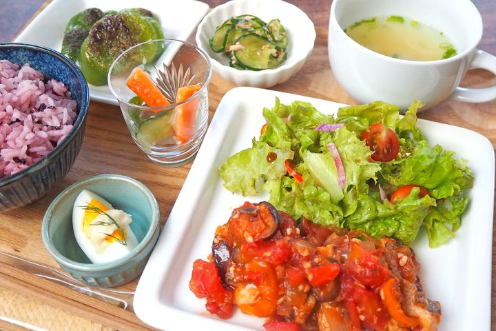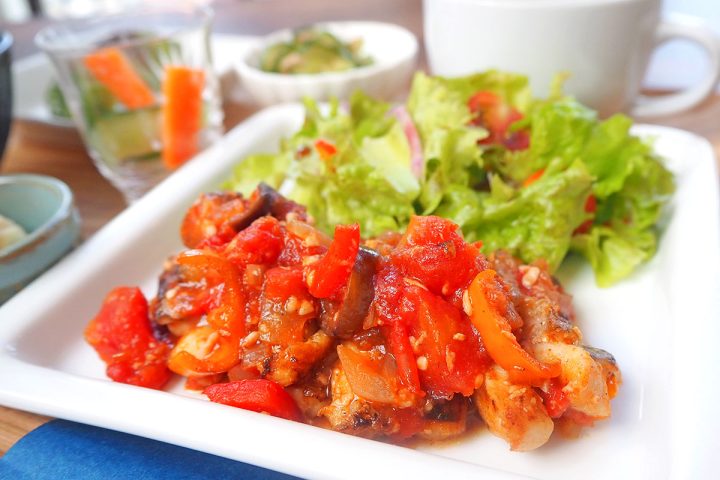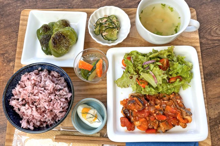 この日のメインは、白身魚と夏野菜の塩麹トマトソース煮。ナスやパプリカなどの夏野菜がたっぷりと入っていて、こうじを使用した甘酸っぱいトマトソースは、ふっくらとした白身魚によく合います。