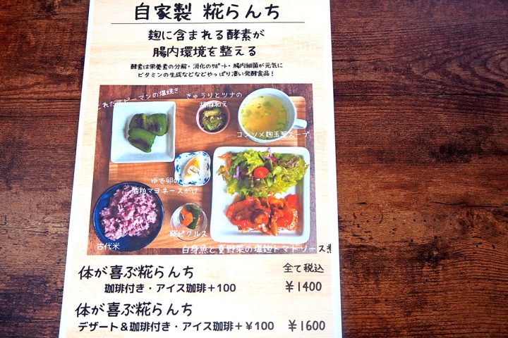 こうじに含まれる酵素には、免疫力を高める効果や、疲労回復、美肌効果などいいことづくめ。アルターナのランチメニューには、たっぷりとこうじが使われているので、体が喜んでいる感じがしますよ。