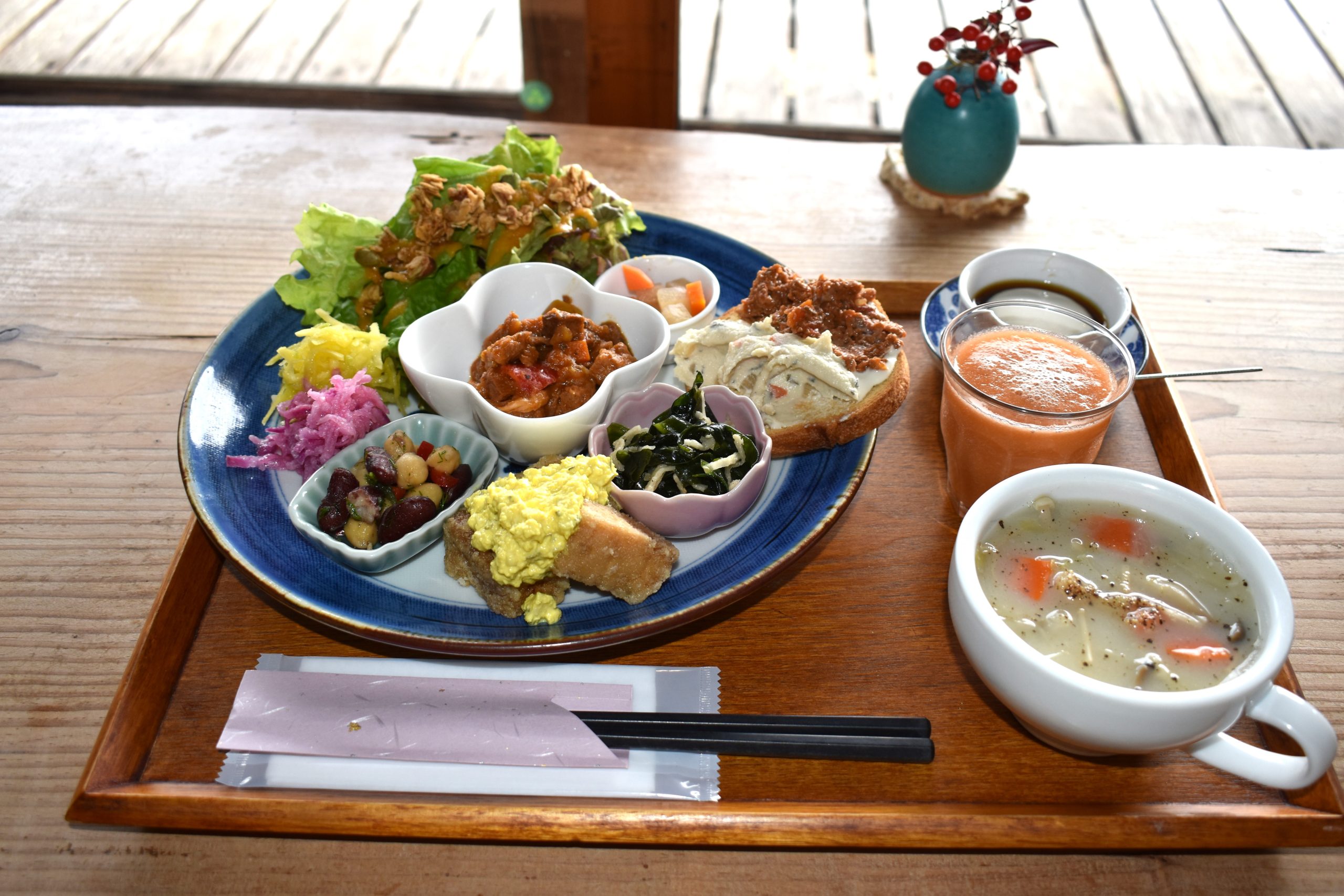 片岡さんはアメリカの大学で5年間ほどヴィーガンを勉強。ヴィーガンのお店でも働いたそうです。野菜たっぷりの食事はデトックス効果があり、体にとても良いとのこと。「体に良い野菜をたっぷりと食べながらのんびりしてほしい」とメッセージをいただきました。