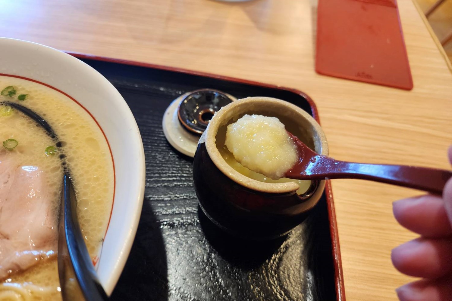ラーメンの中央には「紅生姜」をちょーんと乗せ、その上から「ゴマ」をゴリゴリとすりながらかけます。