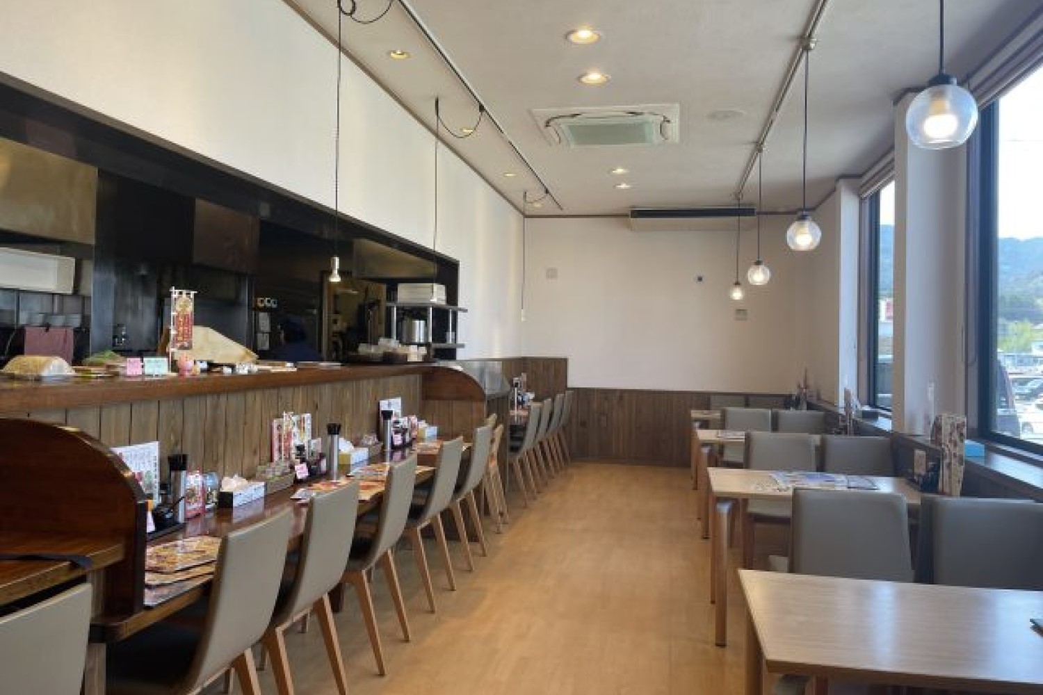 木の温かみを感じさせる清潔感の漂う内装には、カウンター席が10席、4人用テーブルが5つあり、通路も歩きやすいスペースが保たれています。