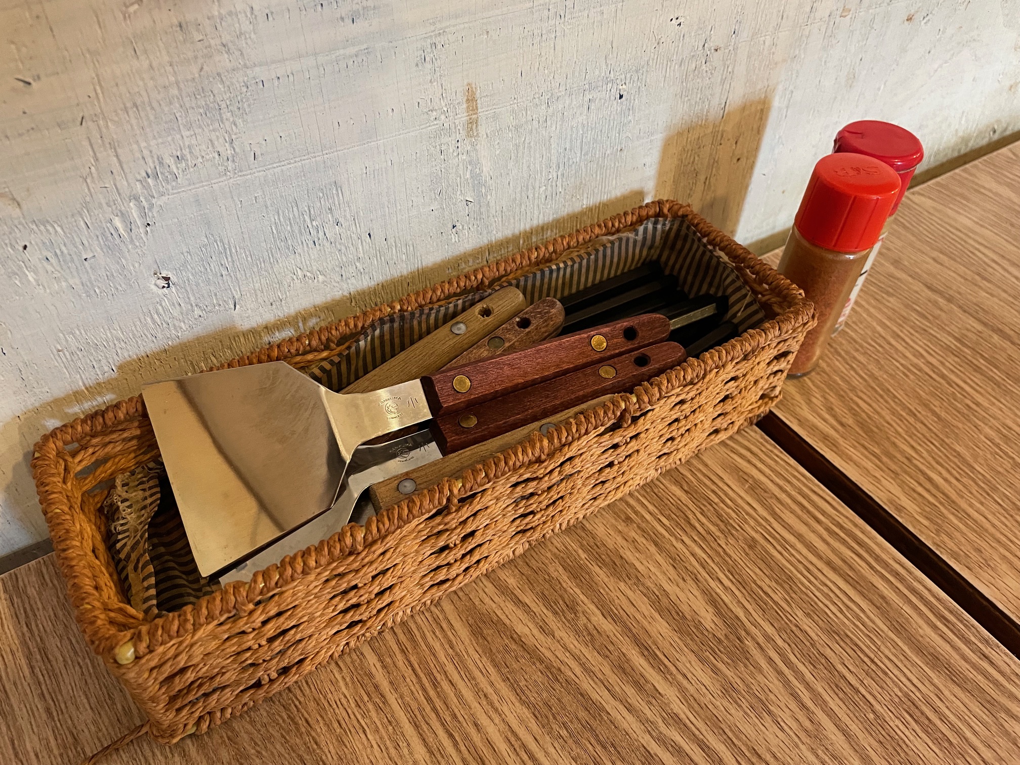 机の上には、ヘラと七味唐辛子など香辛料が置いてあります。