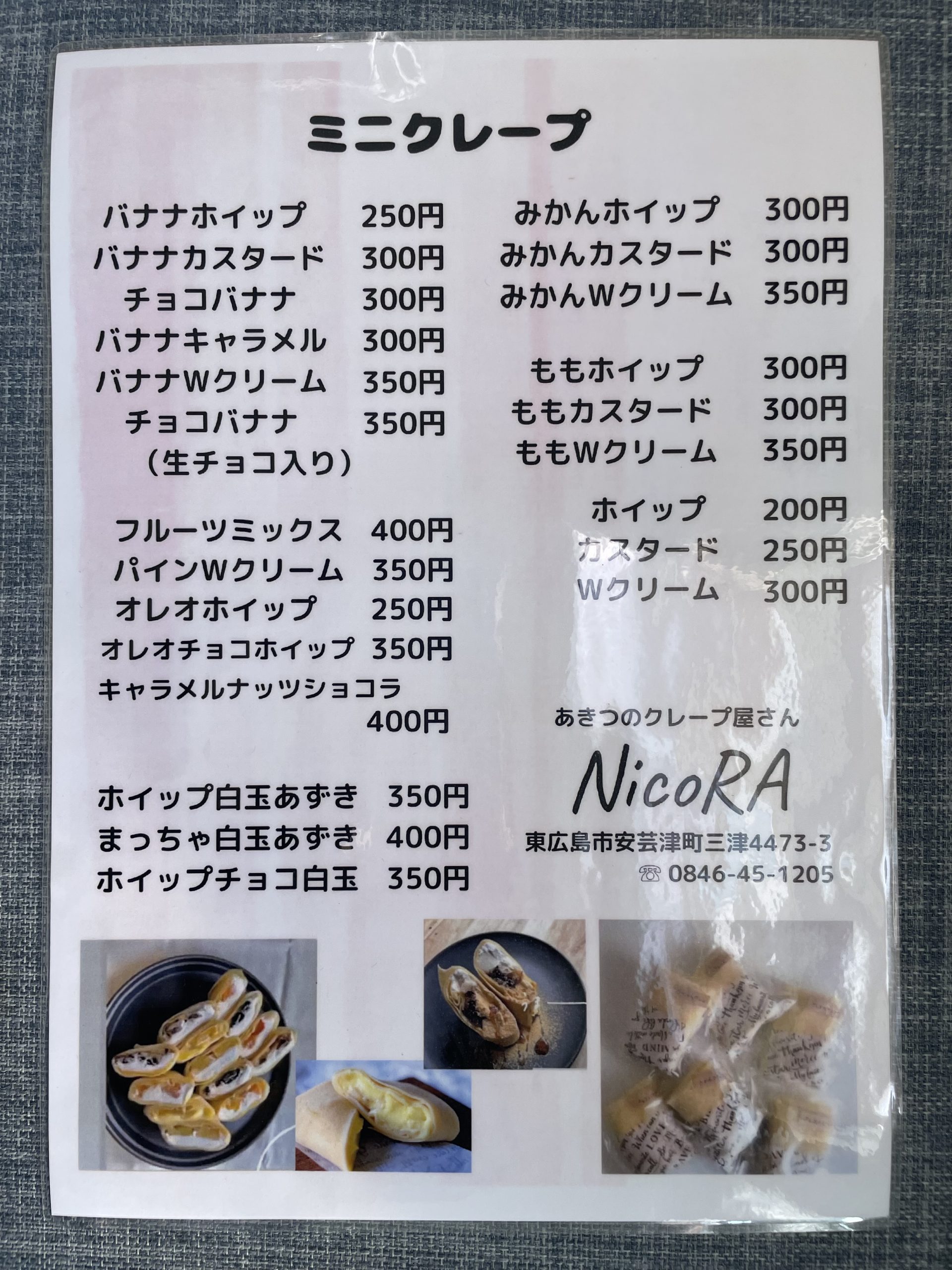 今回は、安芸津町三津にある「あきつのクレープ屋さん NicoRA(二コラ)」のクレープを食べてきました!
