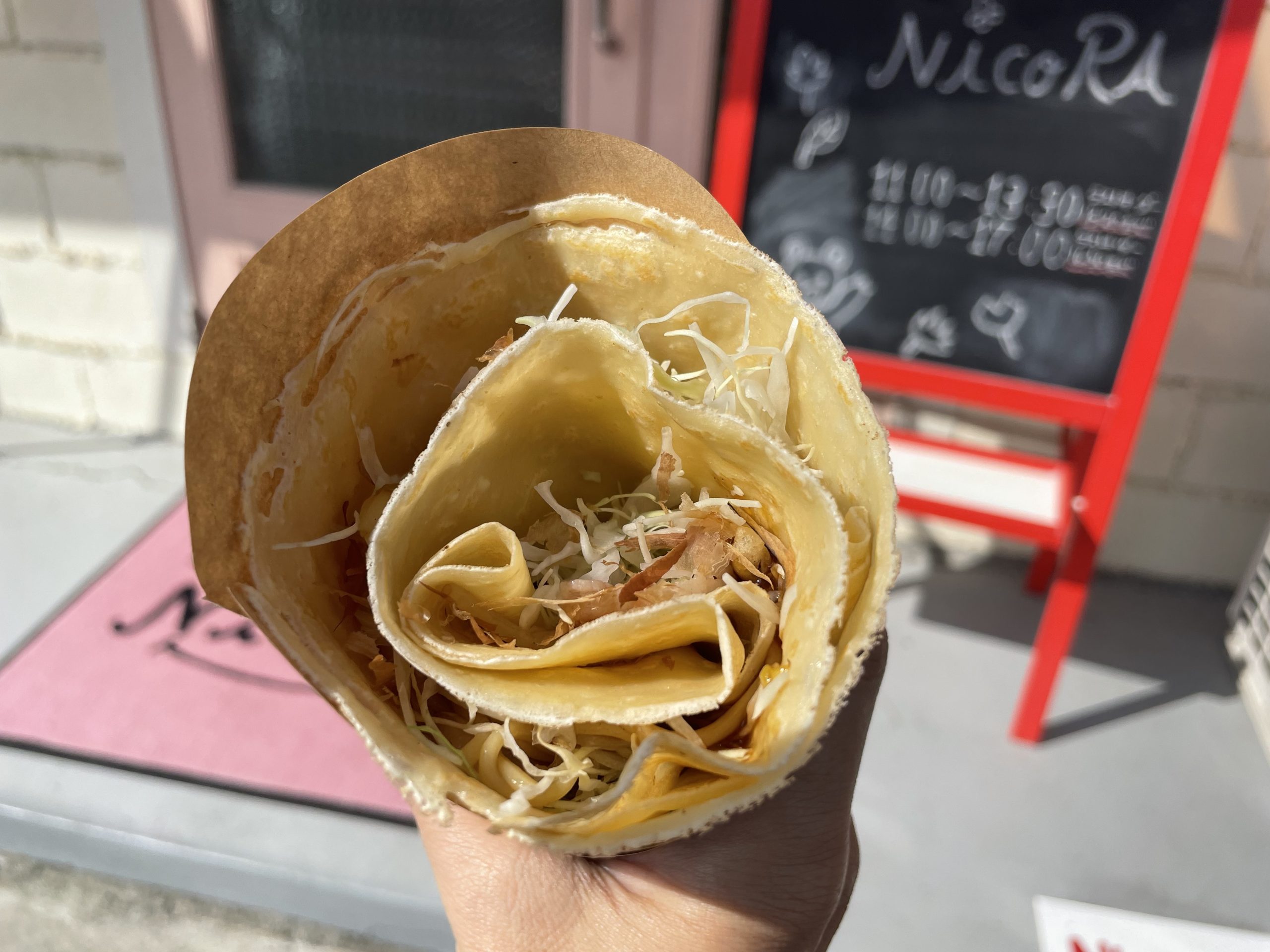 この日いただいたのは「お好み焼き風」クレープ。注文してからの調理のため、店内で少し待っていると、奥からおいしそうなお好み焼きの香りが店内に広がってきました。出来たてのクレープを受け取ると、そのずっしりとした重さにビックリ。