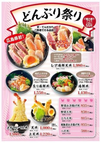 丼メニューは、エビや野菜の天ぷらの「天丼」(1000円)、甘辛たれで食べる「炙り海鮮丼」(1550円)、大きなエビ天がのった「メガてん-てん丼」(1980円)などもあります。