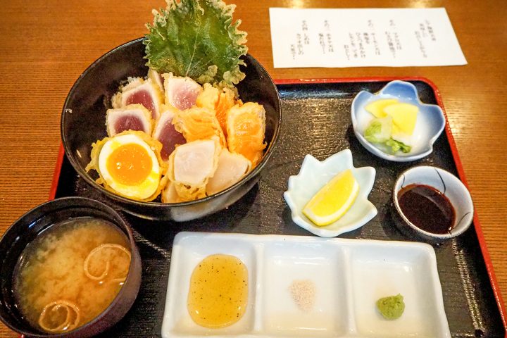 新メニューの「レア海鮮天丼」(1980円)は、5月20日から6月末までの期間限定で提供。刺し身を揚げて半生の状態に仕上げた天丼で、みそ汁と漬物付きです。