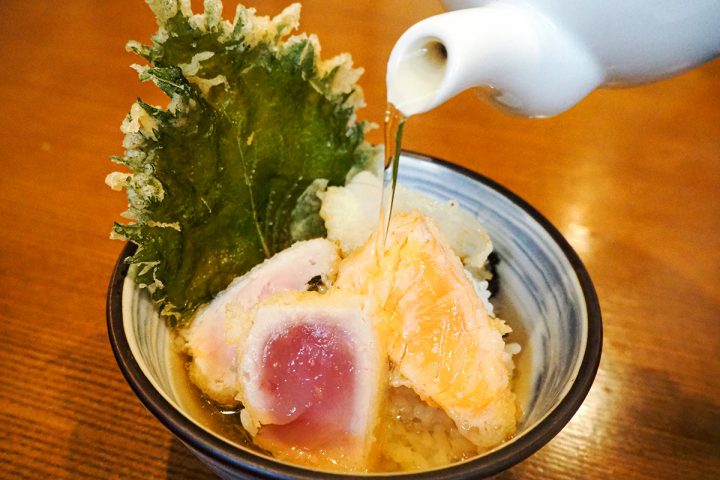 お品書きの食べ方によると、マグロ天はワサビしょうゆ、サーモン天は塩レモン、ホタテ天は塩たれを付けるのがおすすめだそう。しめにお茶漬けも楽しめます。