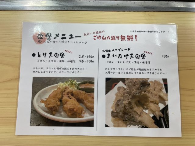 お昼はサクッと揚げた鶏もも肉の「とり天定食」、店主が超超超おすすめの「まいたけ天定食」もあります。昼呑みにも合いそうですね。