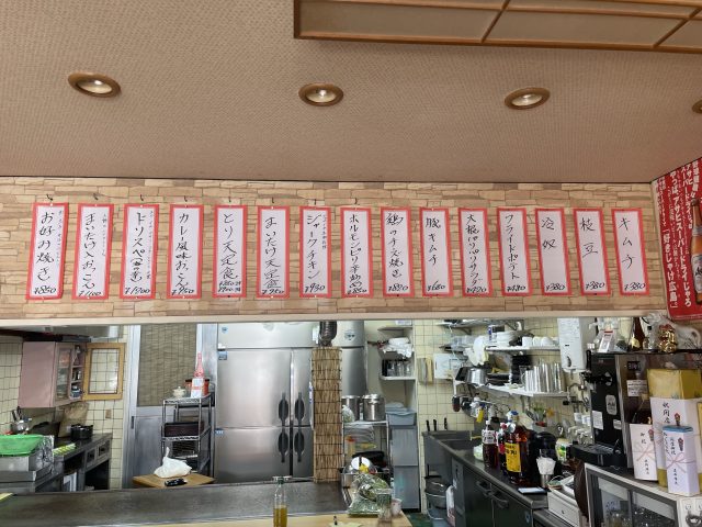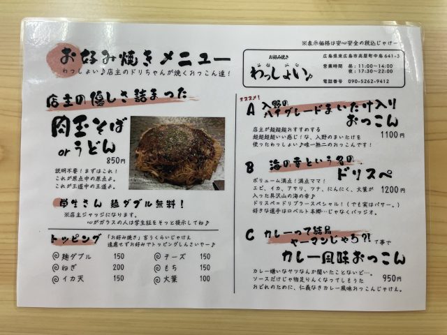 お好み焼きメニューは「肉玉そばorうどん」をはじめ、店主がおすすめ、入野のまいたけ入りおっこん(※ おっこん=お好み焼き)、海の幸がたくさん入った「ドリスぺ」や「カレー風味おっこん」など。ネーミングやメニューの説明にユーモアが溢れてて面白い。つい全部読んでしまいました。
