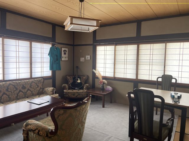 カーペット敷の部屋には、上質なソファ、テーブル、椅子が古民家の和室にしっくりと馴染んでノスタルジックな空間。家具を利用しない場合は別の場所に移動させることもできるそうです。