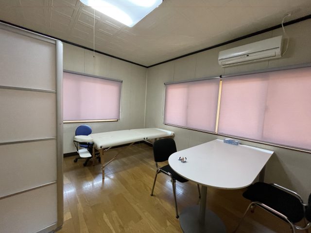 フローリングの洋室です。施術ベッドがあるので、整体やリラクゼーションなどに利用できます。大きな姿見があるので、試着するような販売会などもできそうです。2階にお手洗いや手洗い場があるので、オイルなどを使う施術でも安心。