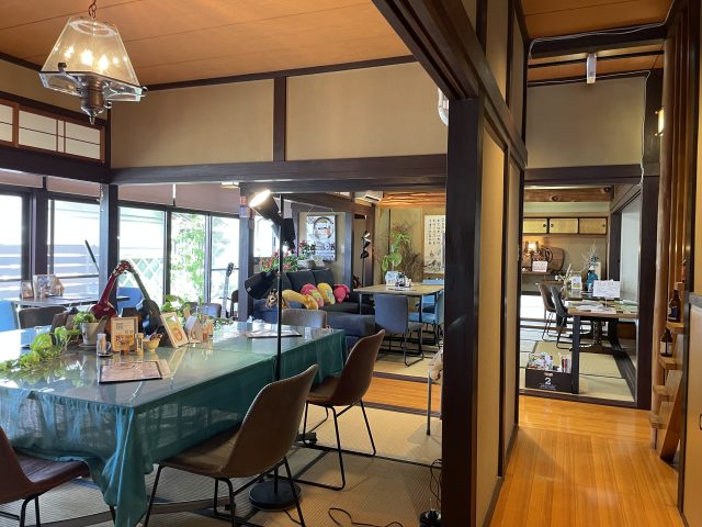 古民家を利用した店舗。1階は食事やカフェメニューはもちろん、広い店内に大きなテーブル&椅子でゆったりと心地よい時間も楽しめます。