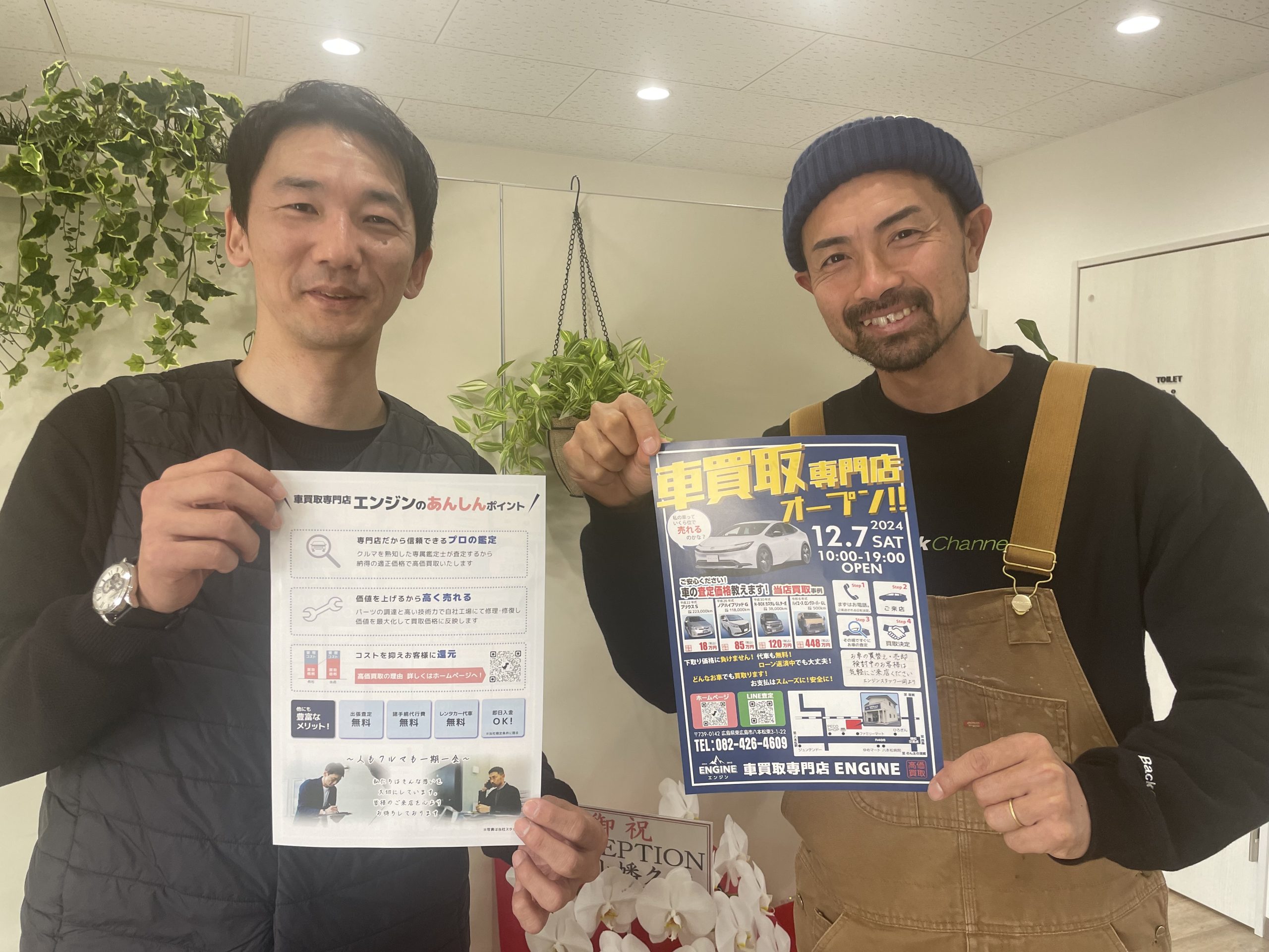 オープンのきっかけを伺うと、「勢いで!」と代表の榎本さんと店長の前安井さんが笑顔で即答!もともと、東広島市黒瀬町で主に四輪駆動車を扱う中古車販売店を運営しており、買取専門店を出せないかと考えていたところ、店舗となる物件が決まり、そこからは、オープンに向けて進んでいったそうです。