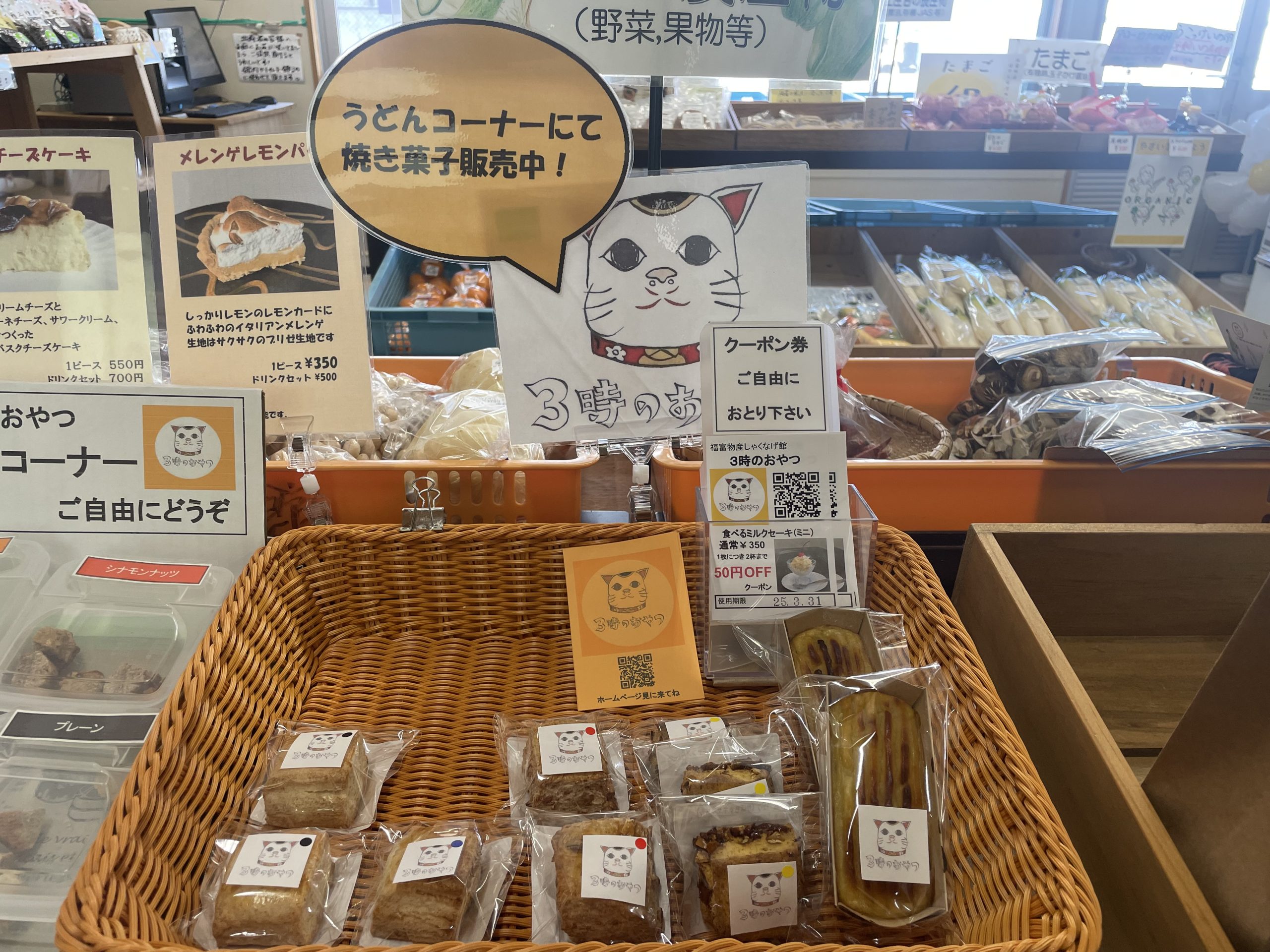 2024年6月より、新事業者「3時のおやつ」が参入し、うどんなどの食事メニューに加えて、焼き菓子などのスイーツメニューも登場!ティータイムも楽しめます。