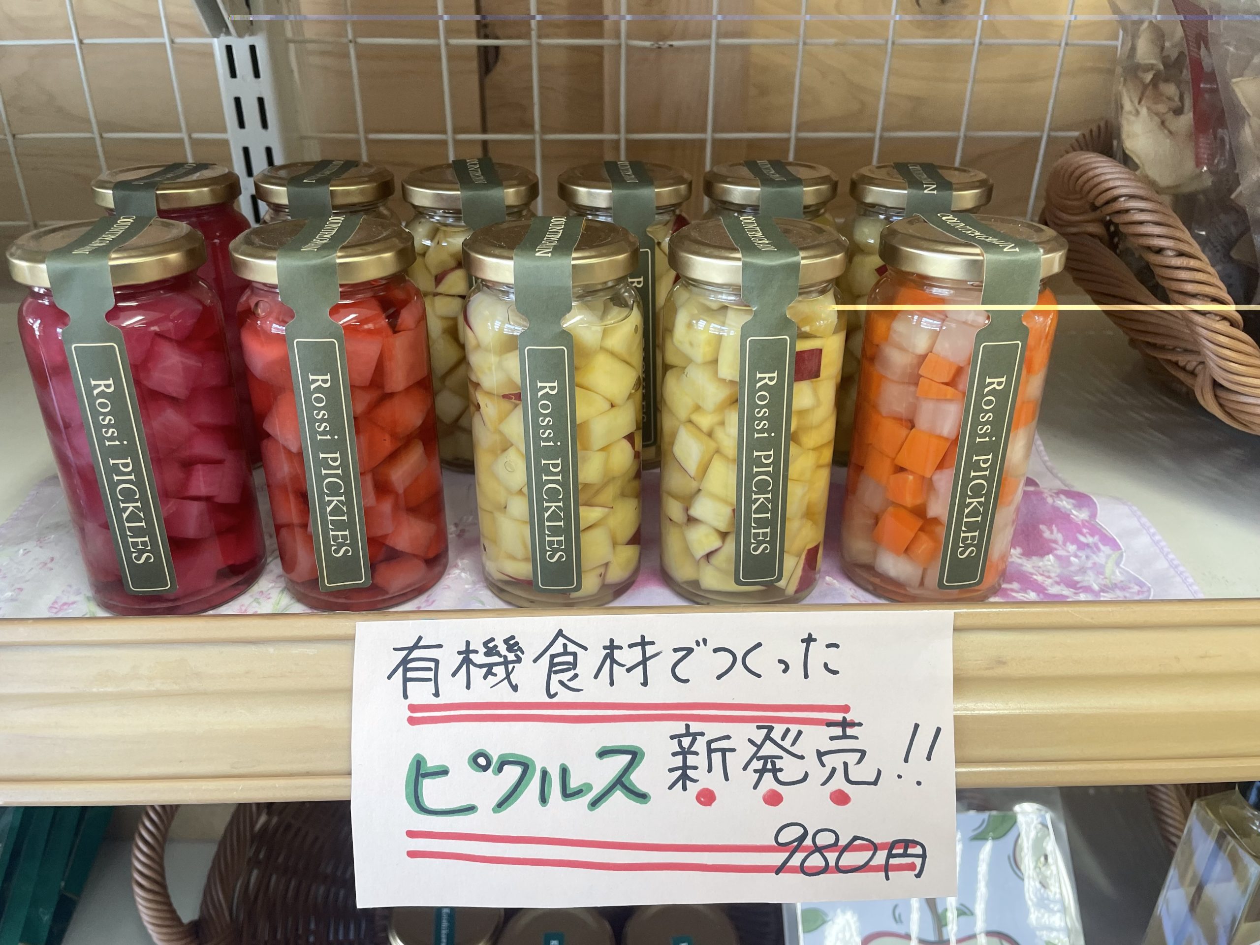 新発売!有機食材でつくったピクルス。彩りもきれいです。サツマイモのピクルス(写真左から4番目)は、サツマイモの甘さと酢のさっぱり感を味わってみて!他にも人参や大根などのピクルスもあります。