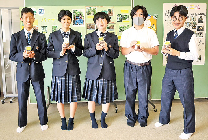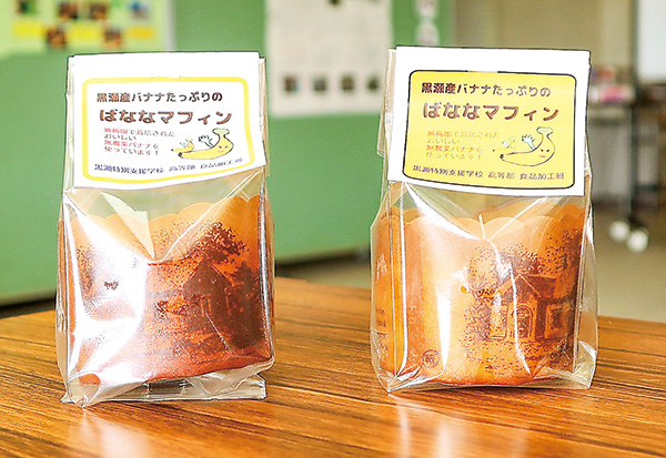 同校高等部の作業学習「食品加工」班の生徒5人が、6月から授業の中で取り組み、同園に製品開発の協力を依頼した。無農薬バナナを使用したマフィンの試作を何回も繰り返し、同園や同校の職員らと試食し意見交換。生徒らは、約5カ月かけて1個85㌘のマフィンを完成させ、販売用のラベルも考案した。