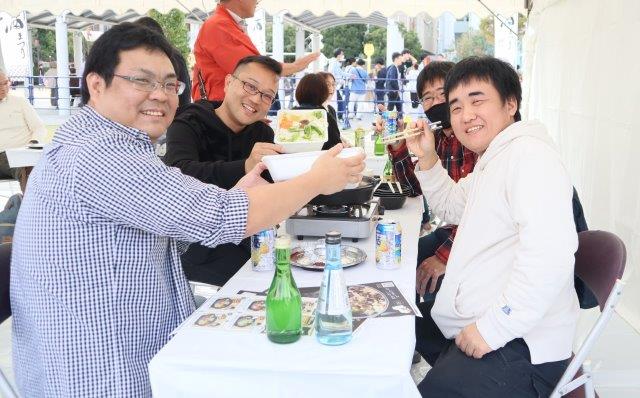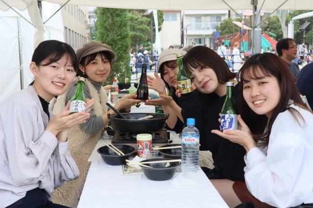 大阪市の寺下桃葉さんら5人は「久しぶりにみんなと会い、おいしい美酒鍋を食べながらお酒をいっぱい飲んで楽しい一日だった」と満面に笑みを浮かべていた。 (山北)