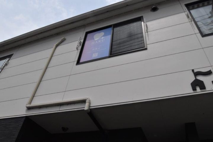 注意して見ていないと見過ごしてしまうかも。2階部分にロゴマークが張られています。