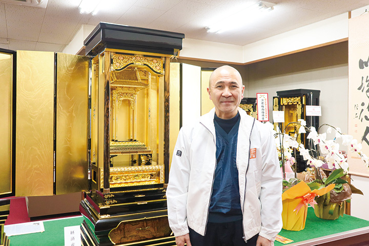 伝統的工芸品の広島仏壇には7つの生産工程があるが、漆(うるし)を塗り金箔(きんぱく)を押す「塗師(ぬし)」は、県内では蓮池さんを含め3人しかいないという。