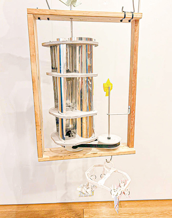 最優秀作品のサタケ賞に選ばれたのは、高屋東小6年三村藍羅さんの「洗濯物くるりん」。弱い風でも回転する風車で、洗濯物を乾きやすくする仕組みの作品で、板が回転するサボニウス型風車の構造を考え、制作した。