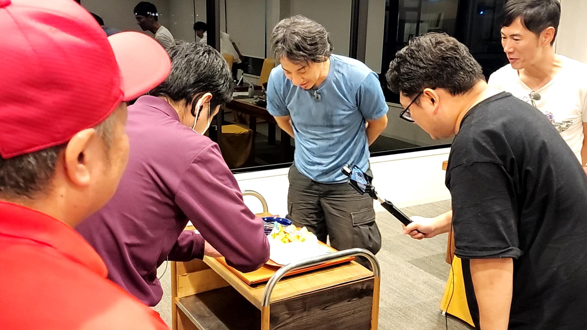 ケーキのロウソクの灯を消すひろゆきさん。ケーキがスタッフの自腹だということを知り、丁寧にお辞儀をしてくださいました。かなり早めのお誕生日のお祝いでしたが、とても喜んでくださいました。