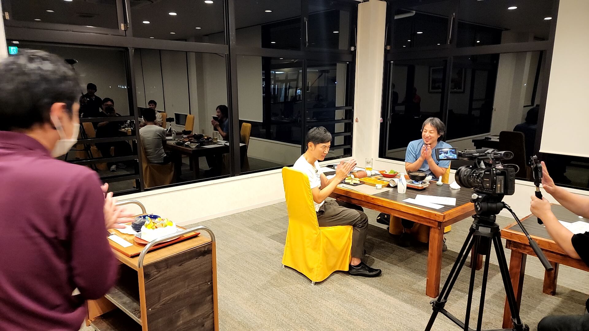 東広島デジタルのスタッフが、ひろゆきさんに誕生日ケーキを用意したいと言い出しました。収録日は11月1日、ひろゆきさんの誕生日は11月16日。少し早いのでは?と思ったものの、「この機会を逃したら会える機会なんてないので!」と押し切られてケーキを用意。お食事がひと段落したタイミングでケーキをお出ししました。