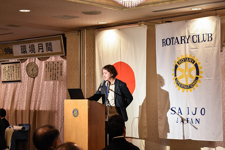 時川監督は4月3日、西条ロータリークラブ(菅生一郎会長)の例会で講演を行った。「惑星ラブソング」については「映画を通じて、若い世代にも平和について考えてもらいたい。戦争問題に自分たちでは何もできないと思うかもしれないが、何かをしないといけないんじゃないかと考えるきっかけになれば」と思いを語った。