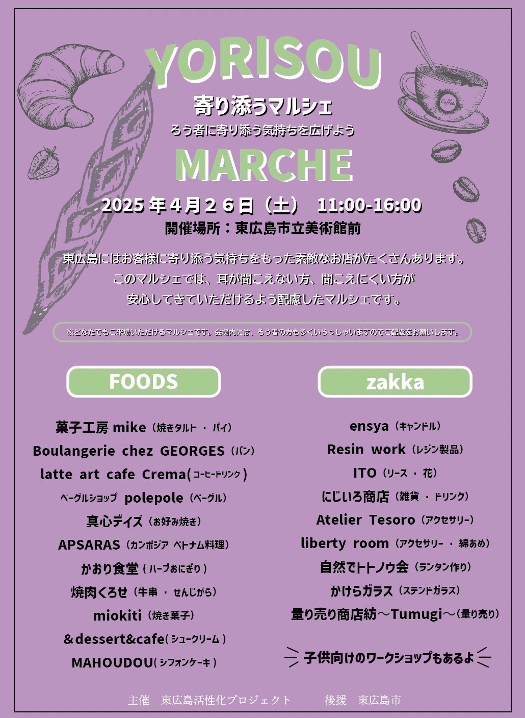 東広島活性化プロジェクトは4月26日(土)、東広島市西条栄町の市立美術館前で、ろう者に寄り添う気持ちを広げるイベント「寄り添うマルシェ」を開きます。11時から16時まで。雨天中止。
