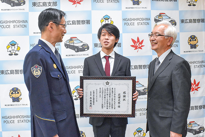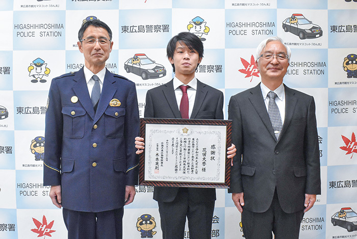 東広島警察署(木本英則署長)は11月25日、東広島市内で行方不明になっていた80歳代の男性を発見し保護したとして、近畿大学工学部(同市高屋うめの辺)1年の花田大誉さん(19)に感謝状を贈り、「素晴らしい行動だった」と感謝した。
