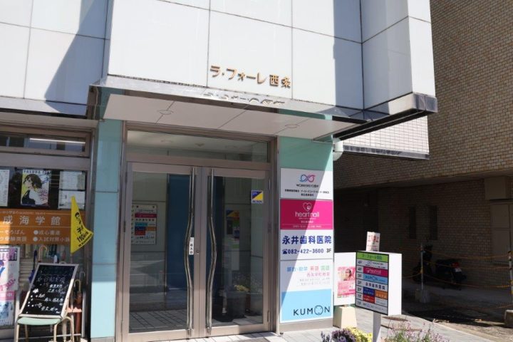 西条駅からブールバールをまっすぐ進み、東広島芸術文化ホールくららの交差点を安芸西条郵便局方面に渡った角のビルの4階です。駅から徒歩5分ほどなので、電車の方でも歩いて行くことができます。