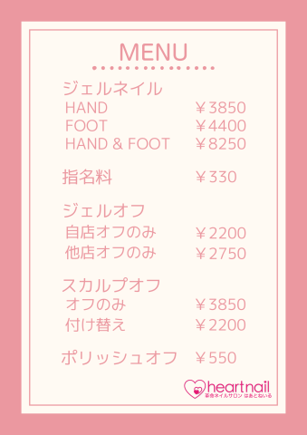 なんとハンドネイルは3,850円、フットネイルは4,400円の定額料金!ビックリです!!爪の形の整え・ドライケア・オイルなども含まれています。ネイルオフは別途2,200円かかりますが、新規の方や1カ月以内のリピートでオフ代が無料に!!料金も革命!!