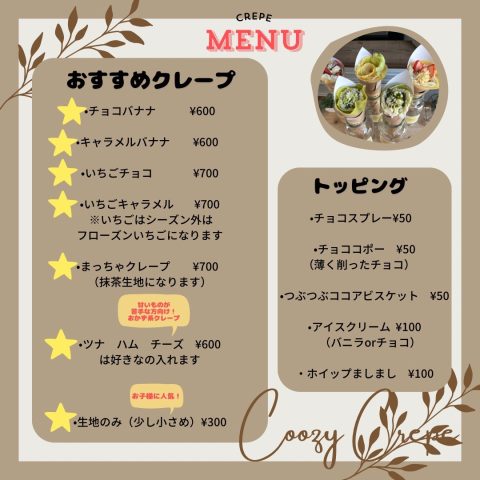 東広島市黒瀬町乃美尾に新しくクレープ屋「Coozy Crepe」さんが5月24日にオープンしました。