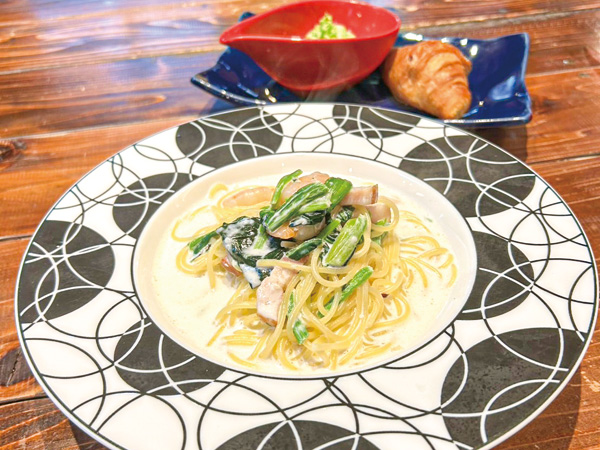 ボルドオのランチメニューはサラダ・パン(モーニングでも提供しているクロワッサン)・ドリンク付き。デュラム小麦の風味とうま味のある生麺パスタが人気。もちもち食感でソースも充実。おかわり自由のフリードリンクもポイントのひとつ。パスタランチは1930円~。