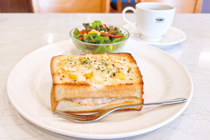 全5種類のモーニングメニューから今回紹介するのはこちら。トーストにサンドされたたっぷりのツナ、さらにその上にまたまたたっぷりのコーンがのった一品。トーストの外側はカリッと、内側は柔らかくもちっとした食感。どこから食べてもツナ&コーンが味わえる。