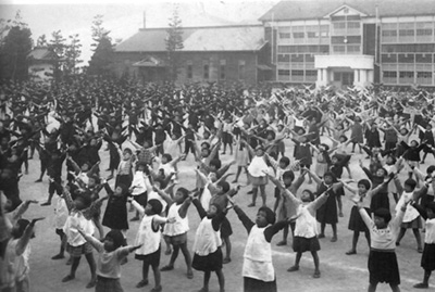 朝会隊形は縦形が一般的であるが、低学年から扇形に広がる隊形、クラスごとの横形朝会は独創的である。