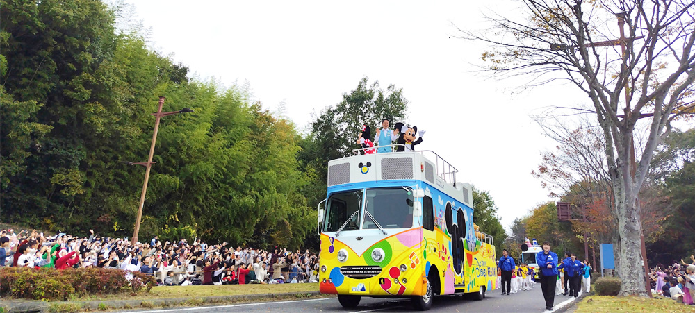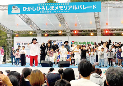 一般社団法人東広島青年会議所(JC、柏迫一正理事長)は11月17日、東広島市の幹線道路ブールバールの一部で市制施行50周年を記念した「ひがしひろしまメモリアルパレード~未来につながる、みんながつながる~」を開催した。東京ディズニーリゾート(TDR)のキャラクターによるパレードもあり、会場は集まった約6万人の笑顔であふれた。