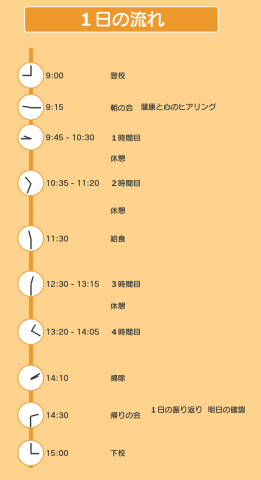 1日のすごし方は上の通りだ。朝の会・帰りの会に長い時間を充ててあるというところに特色がある。この時間では単に伝達をするだけでなく、メンタルチェックや家でのすごし方についても共有する。