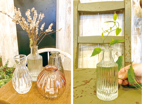 一輪挿しにもピッタリなガラス製の花瓶。アンティークな雰囲気があり、そのままインテリア雑貨として飾ってもよし。生花はもちろん、枝やドライフラワーを飾ってもすてき。