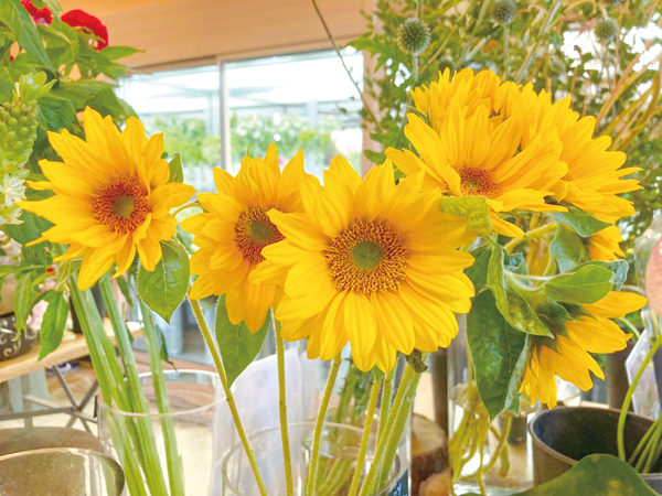 同じヒマワリでも品種によって雰囲気が変わる。一重咲き、八重咲き、花びらが細長いもの、丸いもの、同じ黄色でも黒っぽいもの、レモン色などいろんな品種に出合えるのも夏ならでは。