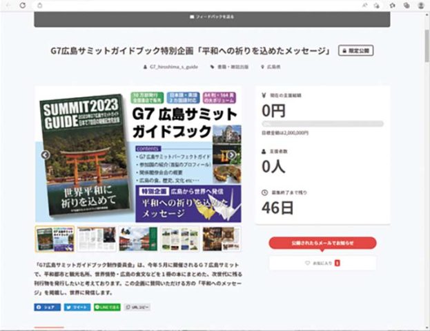 G7広島サミットガイドブックは、「広島サミットガイドブック制作委員会」が、令和5年5月に開催される予定の広島サミットに合わせ、平和都市「広島」を世界に発信する、次世代に残る刊行物(ガイドブック)を発行するため発足したプロジェクトで、平和都市と観光名所、世界情勢・広島の食文などを1冊の本にまとめます。この企画の中で、多くの人の「平和へのメッセージ」を掲載し、世界に発信したいと考えています。そこで、クラウドファンディングを利用し、賛同いただいた人に、このガイドブックの中で「平和への祈りを込めたメッセージ」コーナーに、名前、投稿した平和メッセージを掲載する。本の発行は4月予定。