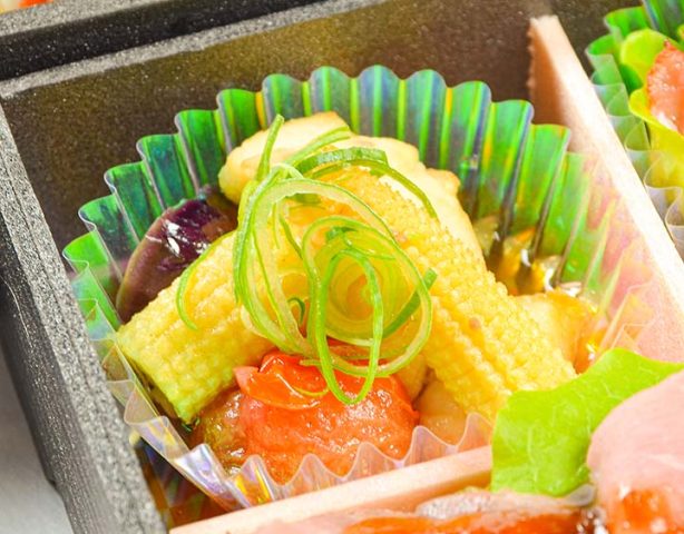 白身魚南蛮漬け、茄子、プチトマト、ヤングコーンの酢の物。