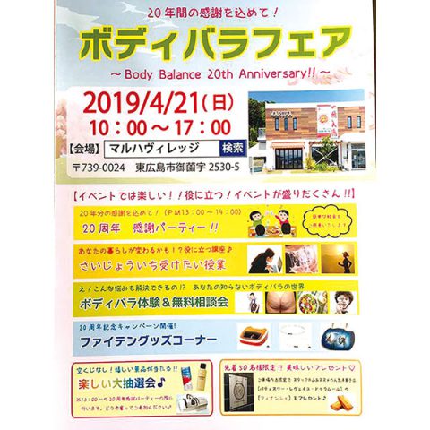 感謝の気持ちを込めて、4月21日、同市西条町御薗宇のマルハヴィレッジで、「ボディバラフェア」を開催する。当日は、整体の体験や頭痛、不眠など体の不調の相談の他、「肩こり撃退法」などの講座もある。