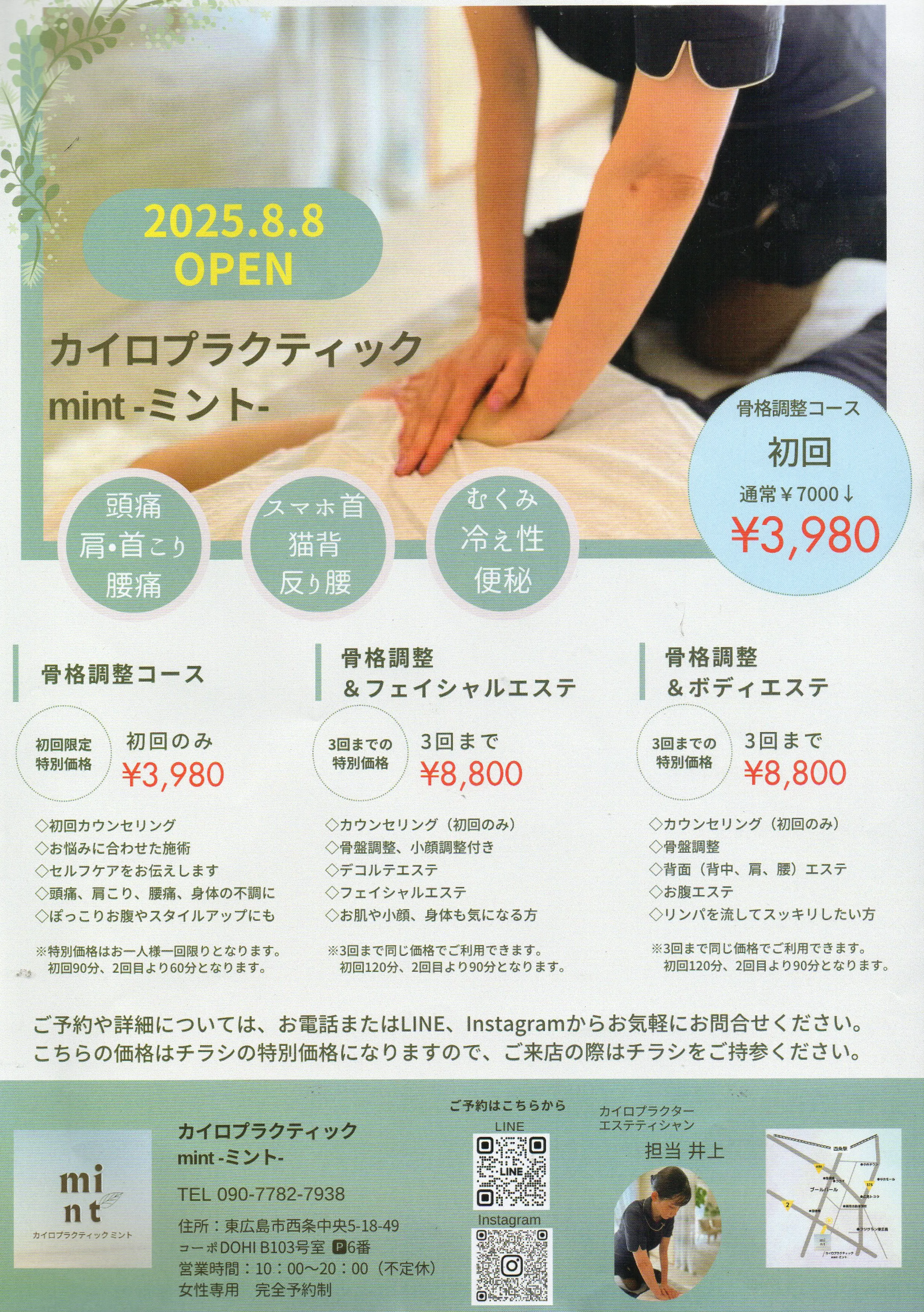 広島県東広島市西条中央に2025年8月8日にオープンした「カイロプラクティックmint」。