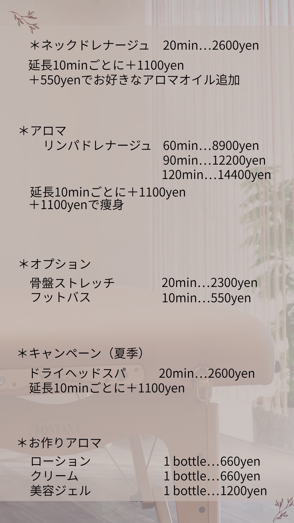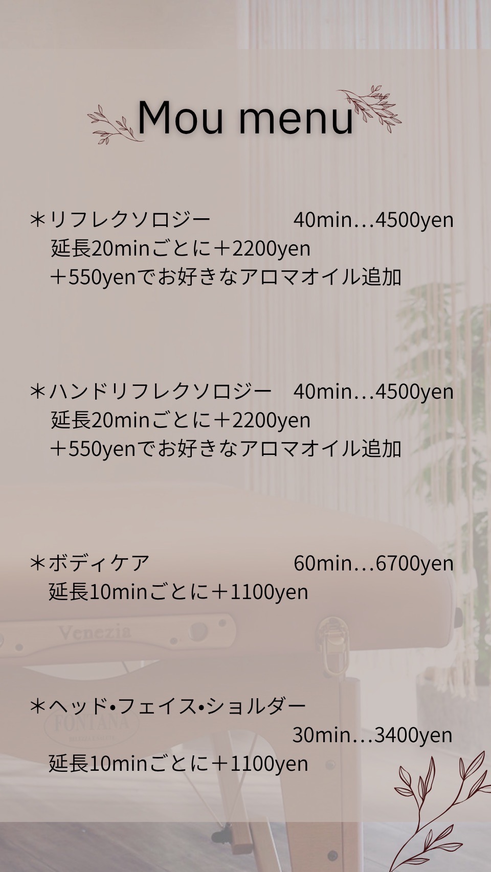 「Mou relaxation aromatherapy」では、熟練のオールハンド施術を提供しています。施術メニューは、リンパ液の循環を促進し体内の老廃物や余分な水分を輩出するリンパドレナージュ、疲労回復やシェイプ効果も期待できるヘッド&フェイス&ショルダーのほぐしメニューなどがあります。アロマ調合もオーダーメイドで行うため、自分だけのリラックスタイムを楽しめます。