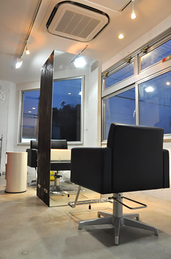 カットブースは2台。東広島では初となるオゾンとビタミンによる効果でよりダメージレスな施術を可能にしたエアウェーブの機械を導入。至るところに置いてあるインテリアも50年以上前にデザインされたこだわりのものばかり。DVDが見られるキッズスペースも用意。